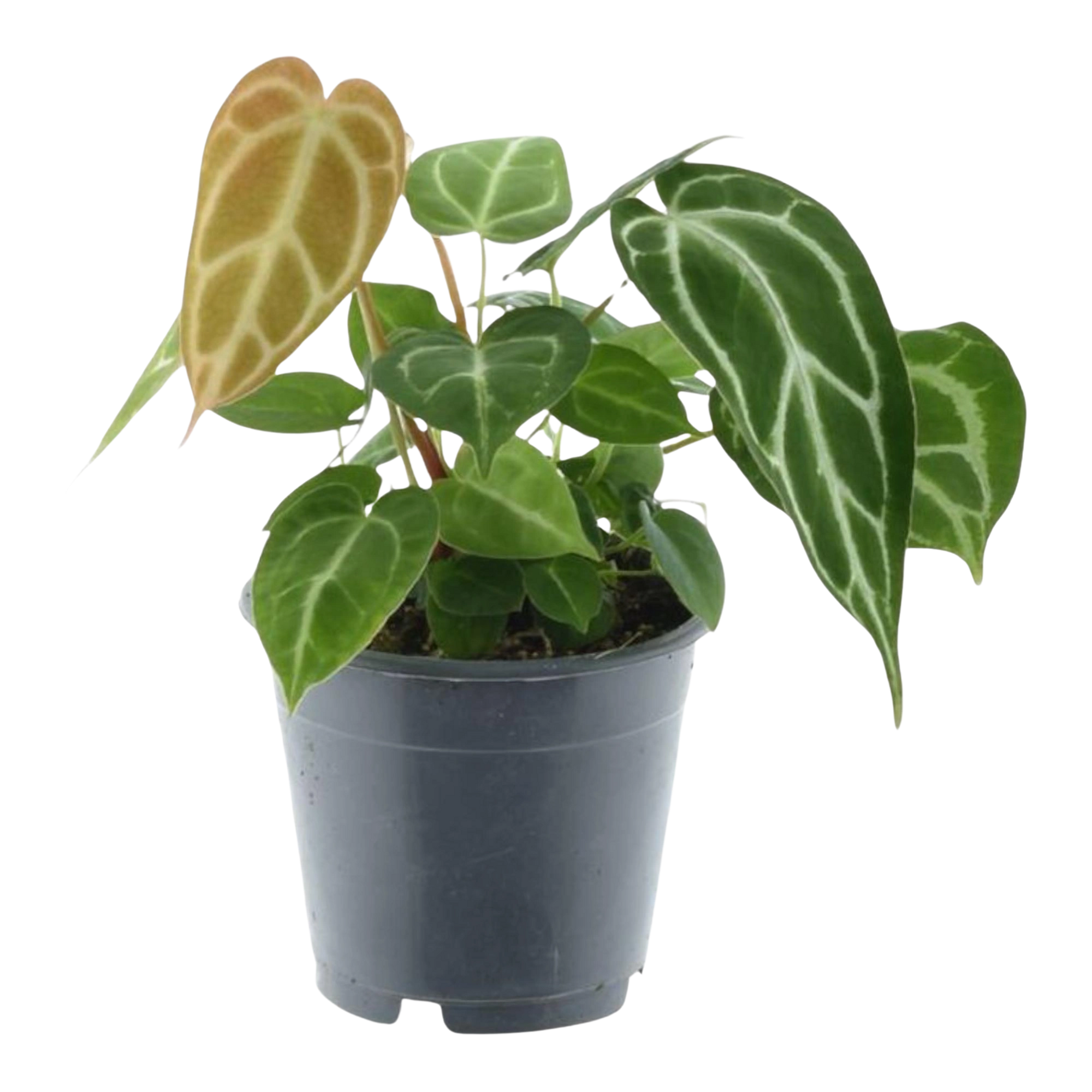 - De bladeren zijn hartvormig en hebben opvallende, witte nerven die een decoratief patroon vormen.