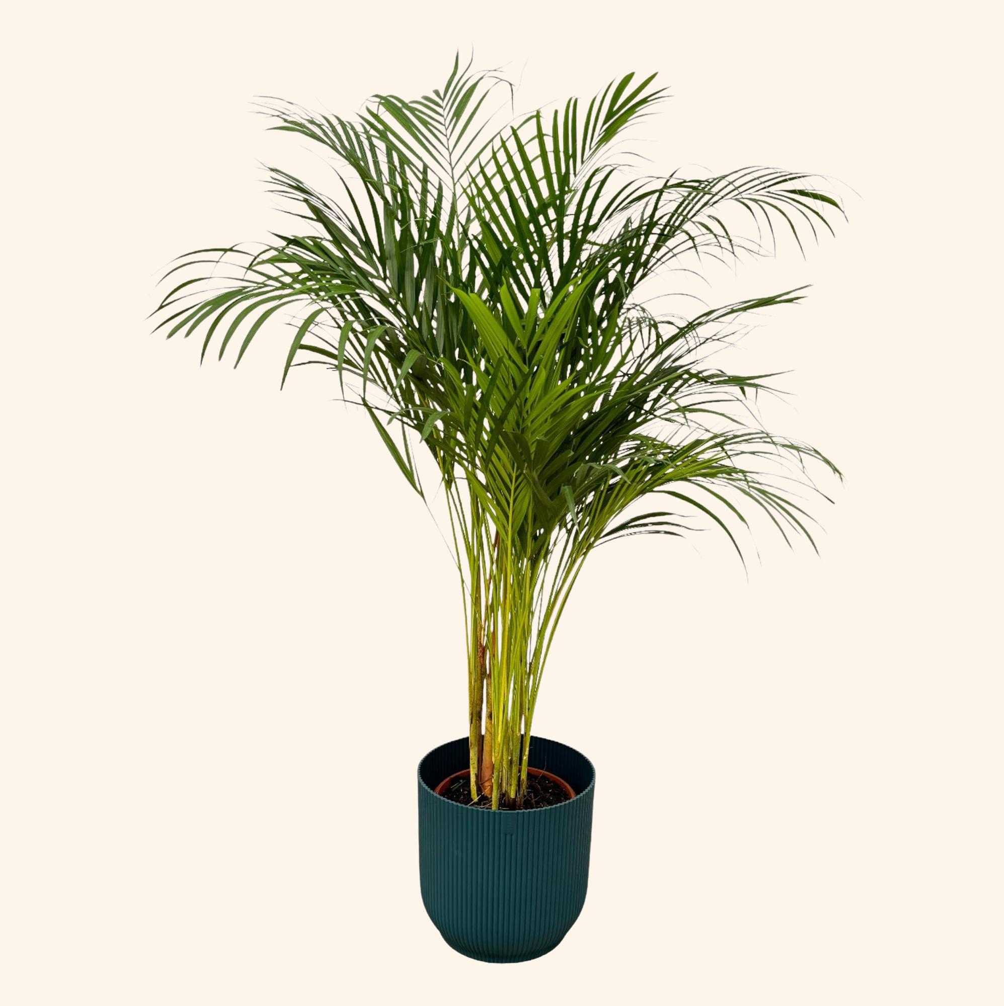De Areca palm heeft lange, sierlijke bladeren die zorgen voor een volle, tropische uitstraling. Geleverd in een witte Elho Vibes Fold Round pot die een frisse en moderne look toevoegt aan ieder interieur. De plant staat het best op een lichte plek zonder direct zonlicht en is perfect voor woon- en werkruimtes. Houd de grond licht vochtig; geef in de zomer meer water dan in de winter. Verpakt in een stevige doos voor een veilige en onbeschadigde levering.