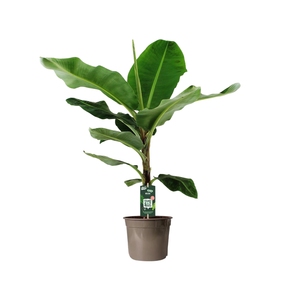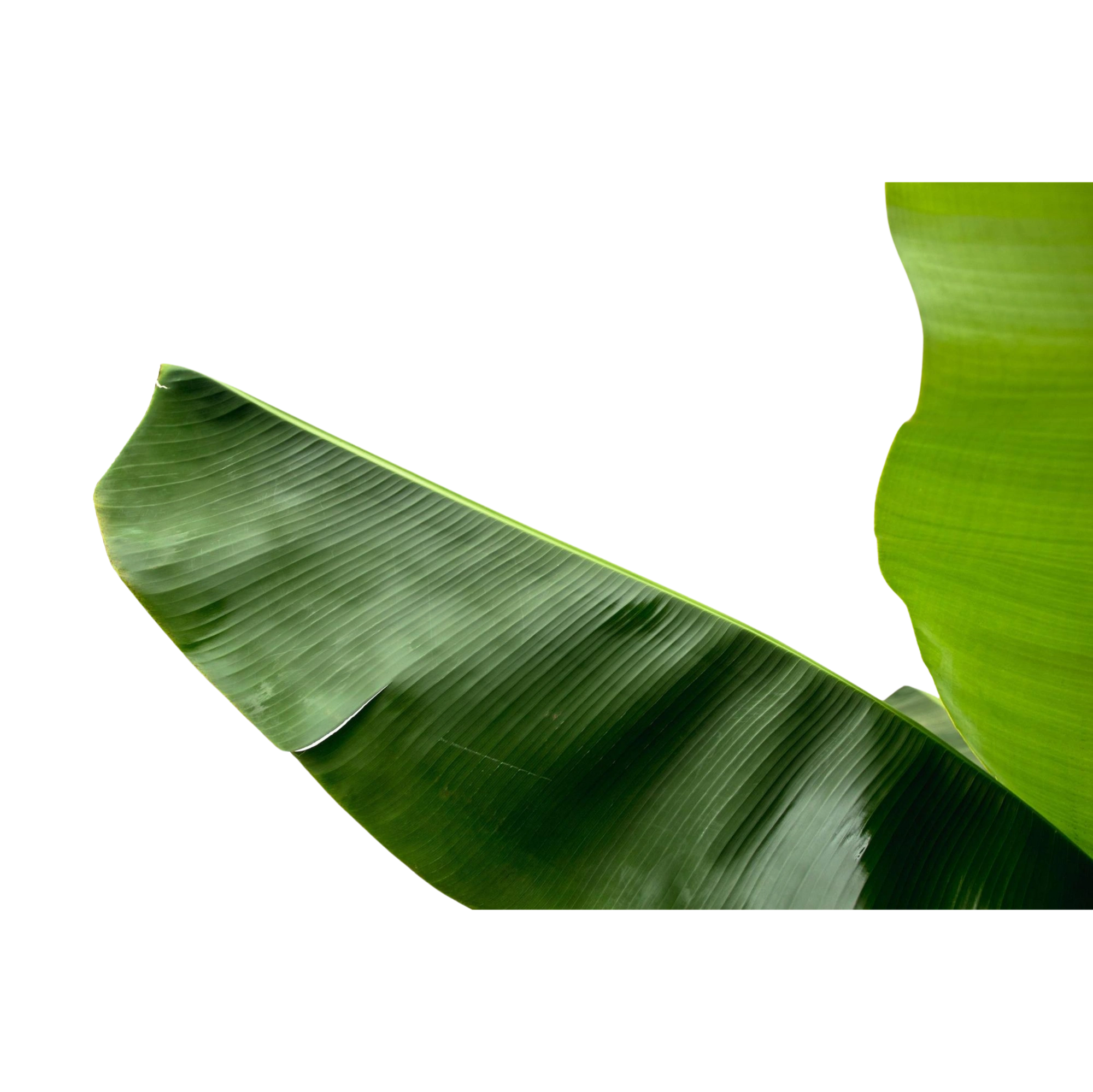 Uiterlijk van de plant: De Bananenplant heeft grote, groene bladeren die breed en langwerpig van vorm zijn. De bladeren hebben een glad oppervlak en een tropische uitstraling, wat de plant een exotische sfeer geeft.