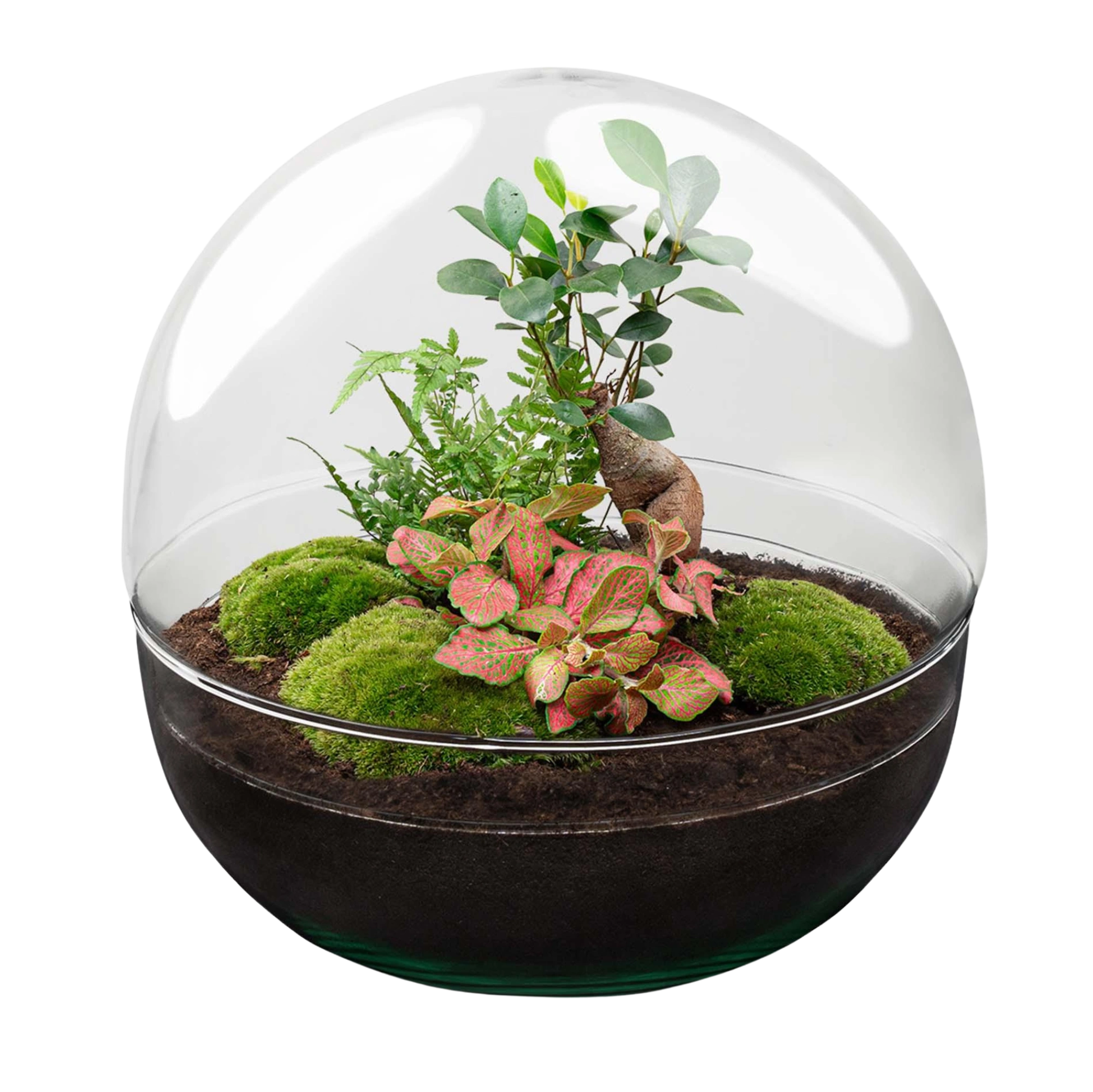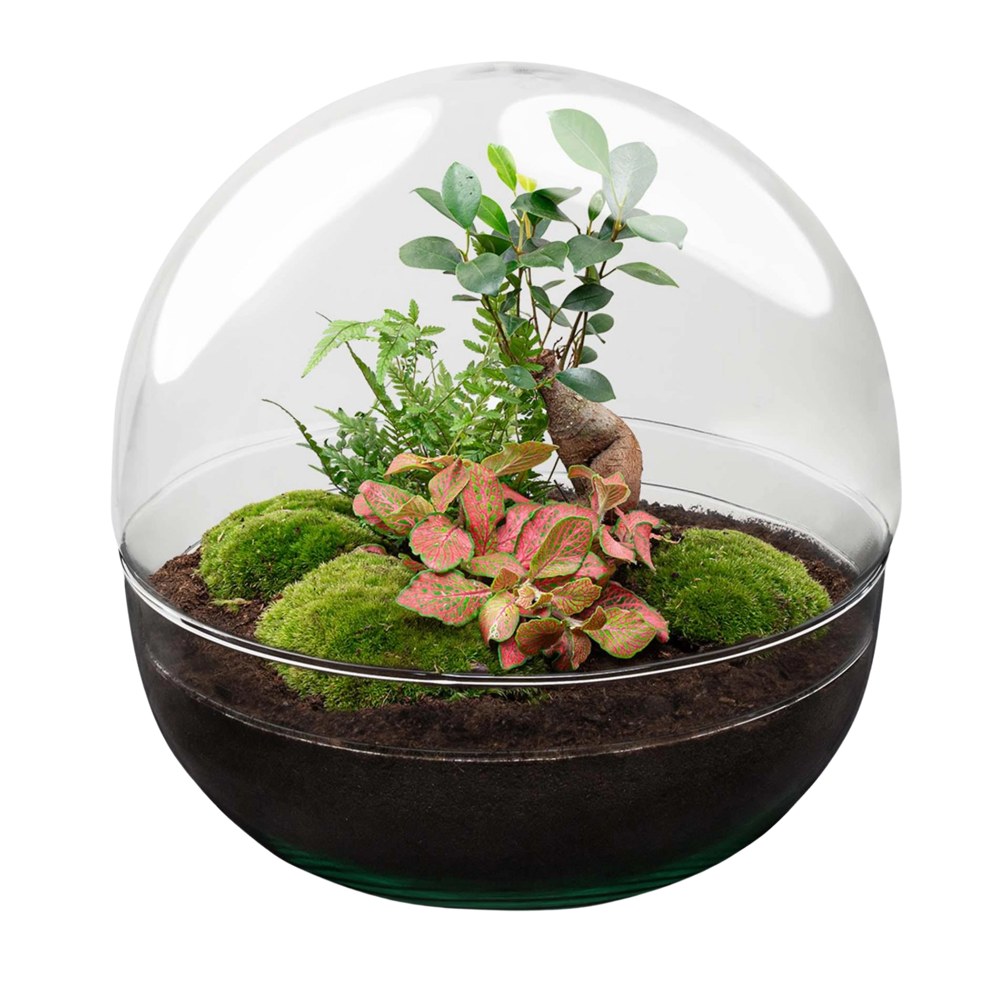 Met een Do-It-Yourself planten terrarium haal je een zelfvoorzienende biotoop in huis waar je nog jarenlang plezier van zal hebben. Nadat jijzelf, of de persoon waaraan jij dit terrarium cadeau gaat geven, met het meegeleverde vijf-stappenplan zelf je eigen mini-ecosysteem in elkaar hebt gezet wordt het water via verdamping door de planten en mossen gerecycled.