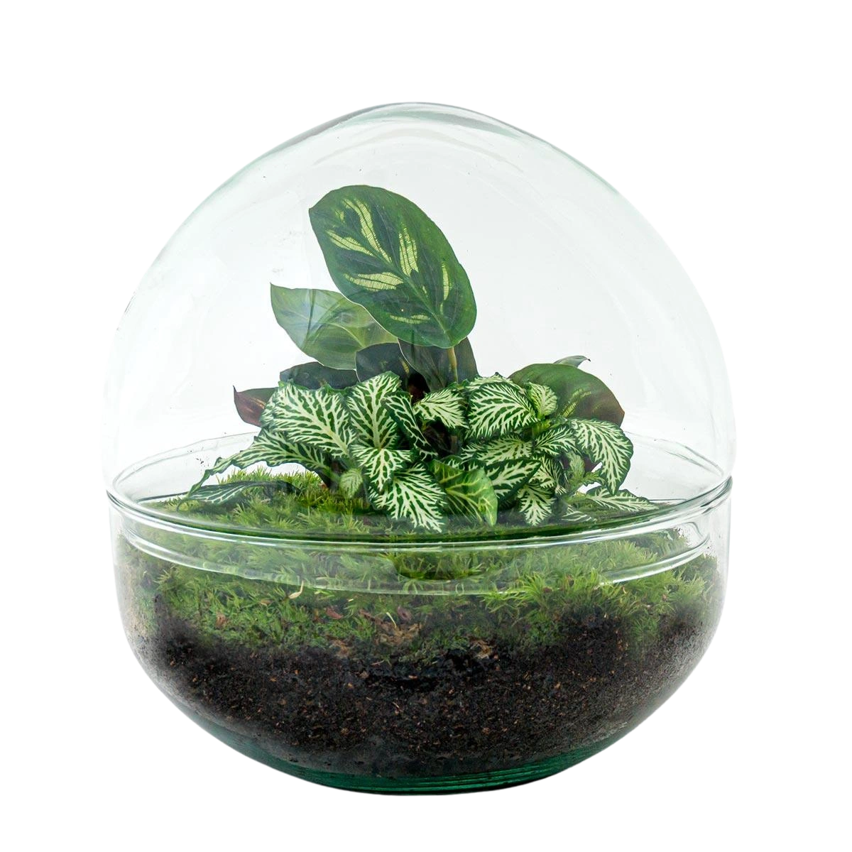 Met een Do-It-Yourself planten terrarium haal je een zelfvoorzienende biotoop in huis waar je nog jarenlang plezier van zal hebben. Nadat jijzelf, of de persoon waaraan jij dit terrarium cadeau gaat geven, met het meegeleverde vijf-stappenplan zelf je eigen mini-ecosysteem in elkaar hebt gezet wordt het water via verdamping door de planten en mossen gerecycled.