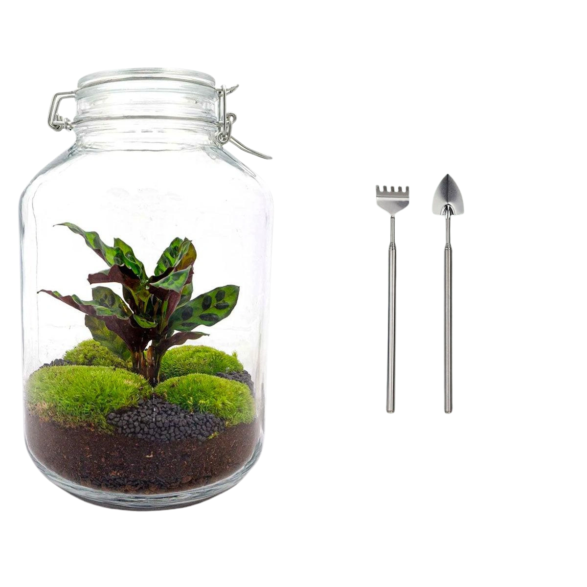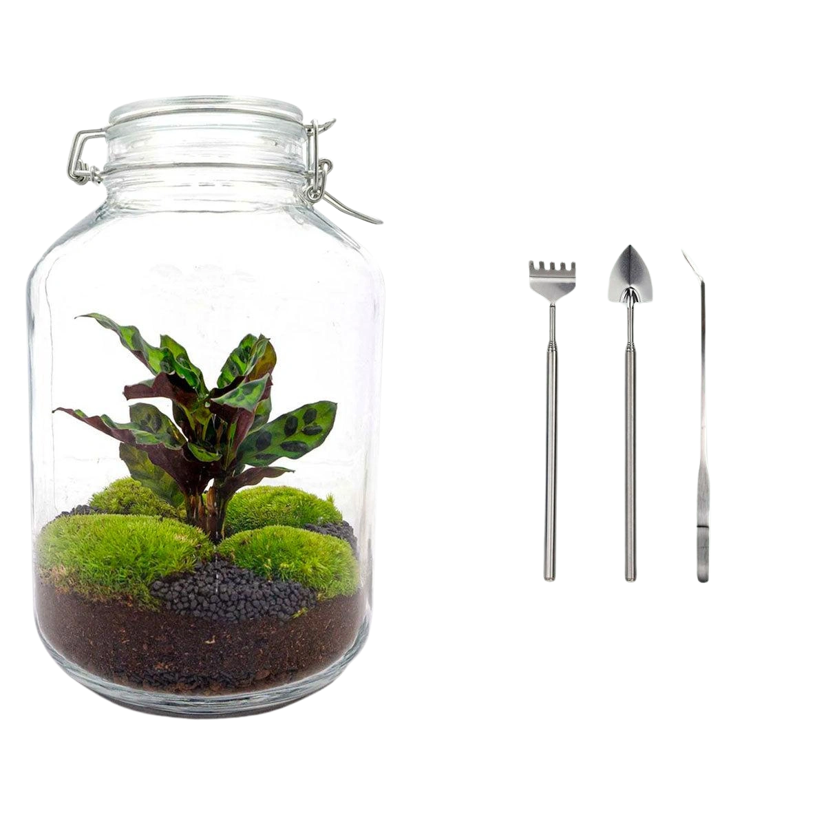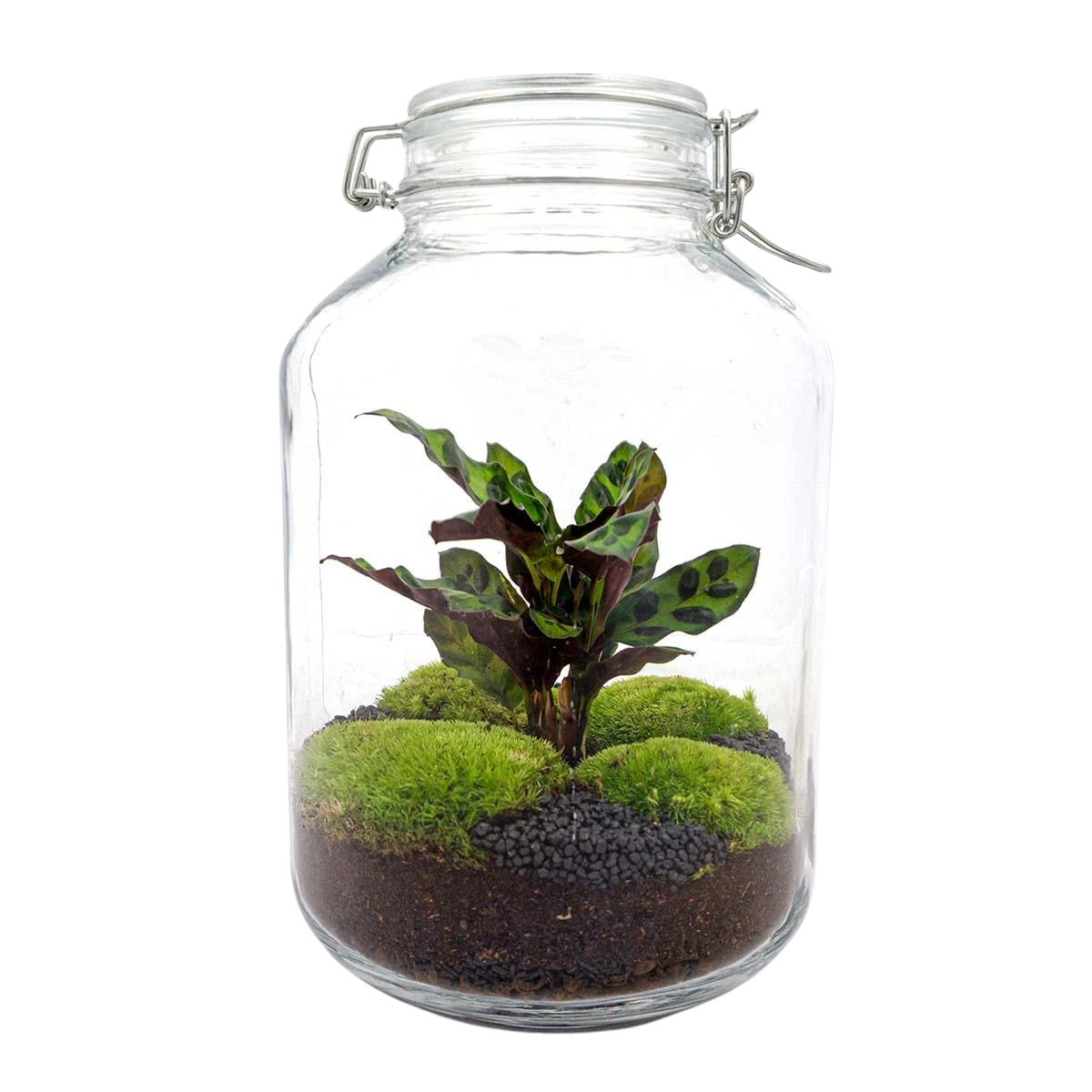 Met een Do-It-Yourself planten terrarium haal je een zelfvoorzienende biotoop in huis waar je nog jarenlang plezier van zal hebben. Nadat jijzelf, of de persoon waaraan jij dit terrarium cadeau gaat geven, met het meegeleverde vijf-stappenplan zelf je eigen mini-ecosysteem in elkaar hebt gezet wordt het water via verdamping door de planten en mossen gerecycled.