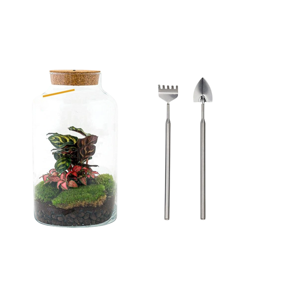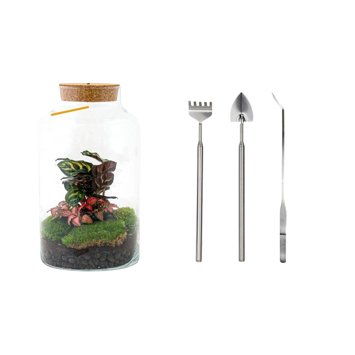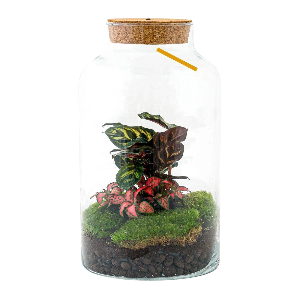 Met een Do-It-Yourself planten terrarium haal je een zelfvoorzienende biotoop in huis waar je nog jarenlang plezier van zal hebben. Nadat jijzelf, of de persoon waaraan jij dit terrarium cadeau gaat geven, met het meegeleverde vijf-stappenplan zelf je eigen mini-ecosysteem in elkaar hebt gezet wordt het water via verdamping door de planten en mossen gerecycled.