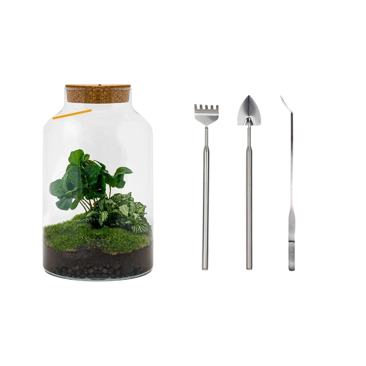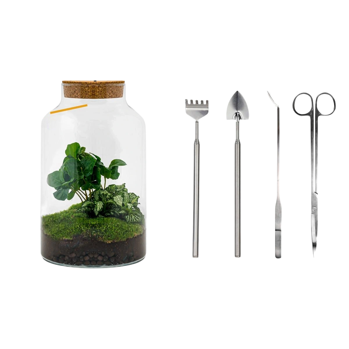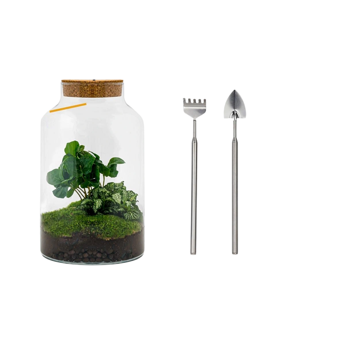Met een Do-It-Yourself planten terrarium haal je een zelfvoorzienende biotoop in huis waar je nog jarenlang plezier van zal hebben. Nadat jijzelf, of de persoon waaraan jij dit terrarium cadeau gaat geven, met het meegeleverde vijf-stappenplan zelf je eigen mini-ecosysteem in elkaar hebt gezet wordt het water via verdamping door de planten en mossen gerecycled.