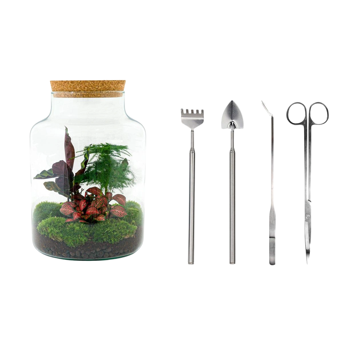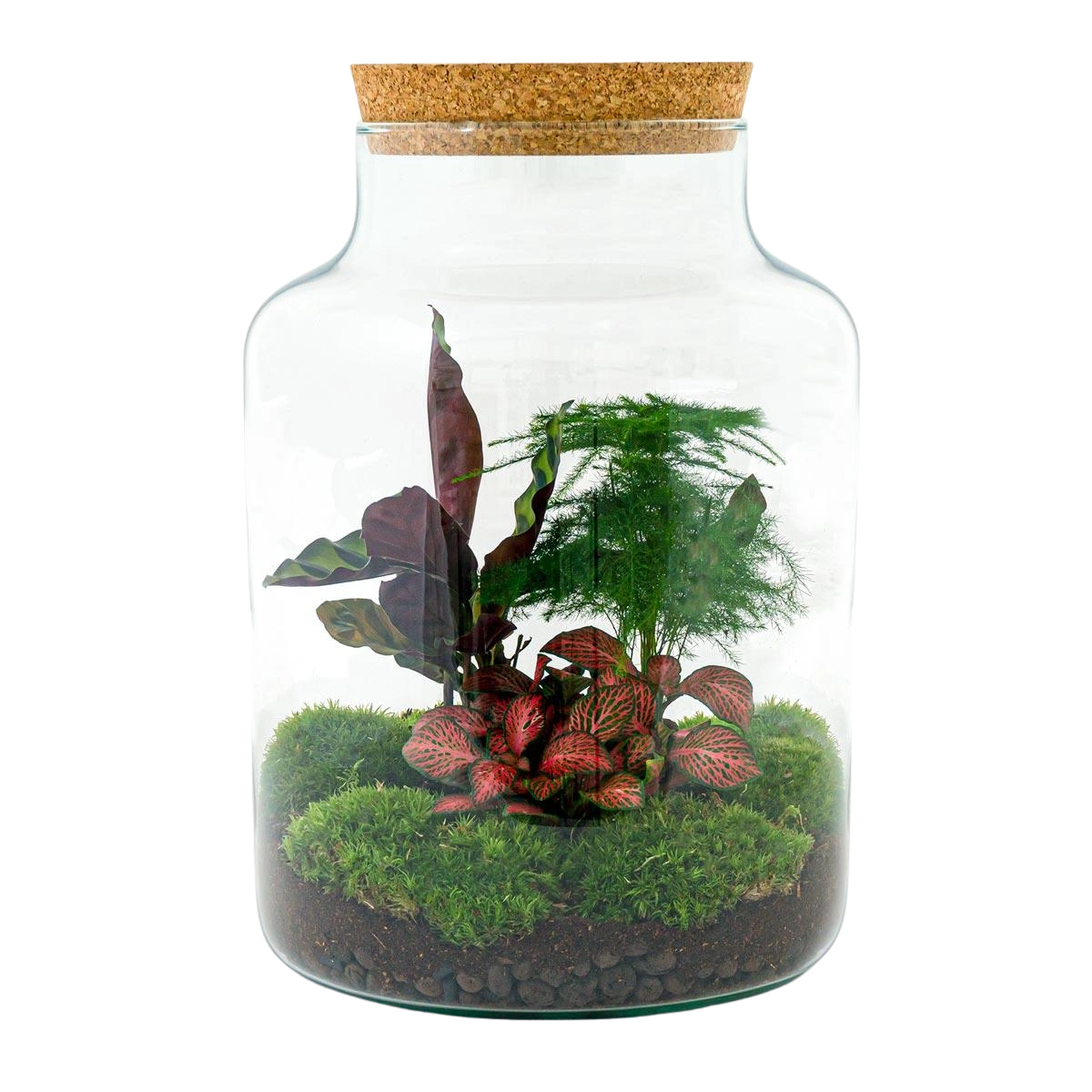 Met een Do-It-Yourself planten terrarium haal je een zelfvoorzienende biotoop in huis waar je nog jarenlang plezier van zal hebben. Nadat jijzelf, of de persoon waaraan jij dit terrarium cadeau gaat geven, met het meegeleverde vijf-stappenplan zelf je eigen mini-ecosysteem in elkaar hebt gezet wordt het water via verdamping door de planten en mossen gerecycled.