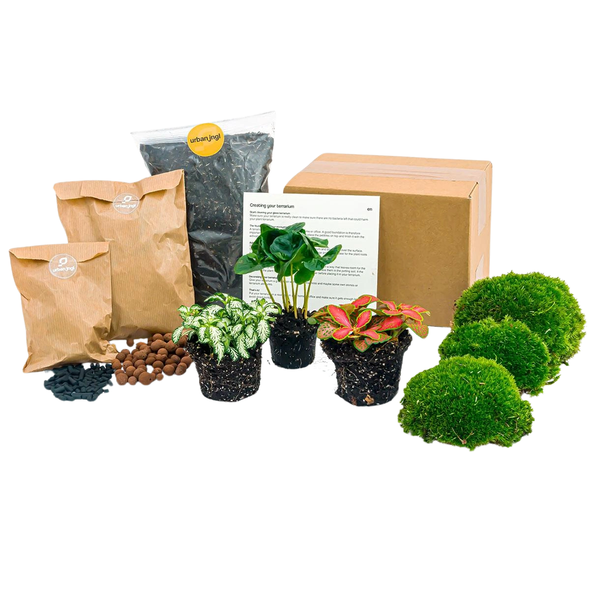 Creëer in iedere ruimte een urban jungle met onze terrarium pakketten. Of je nu helemaal opnieuw begint of een bestaande terrarium fles nieuw leven in wil blazen, dit planten terrarium pakket heeft alles wat je nodig hebt om een urban jungle in een fles nieuw leven in te blazen. Wat zit er in ons terrarium pakket? - Terrarium planten (3 stuks) - Coffea Arabica - Fittonia White tiger - Fittonia rood/oranje - Verse bolmossen - Hydrokorrels - Actieve kool - Terrarium potgrond - Stappenplan voor het maken van je terrarium - Verzorgingstips