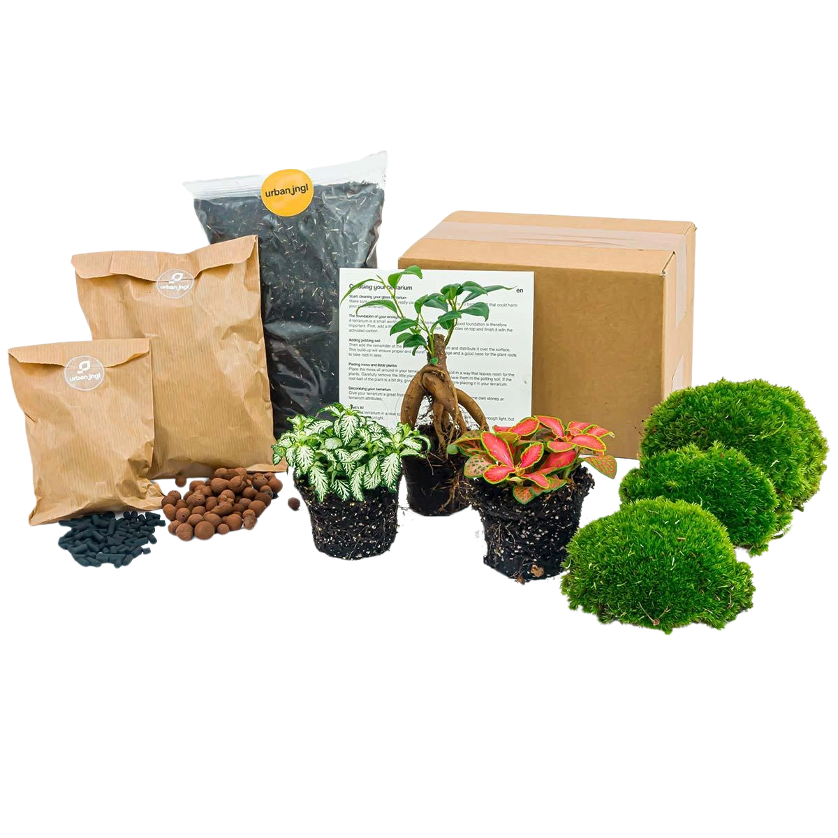 Alles wat je nodig hebt om een planten terrarium te maken of om je bestaande planten terrarium weer op te frissen. Wat zit er in dit planten terrarium pakket? -Terrarium planten -Ficus Ginseng bonsai -Fittonia Wit (Fittonia White Tiger) -Fittonia Rood (Forest Flame) -Bolmossen -Actieve kool -Hydrokorrels -Terrarium potgrond -Terrarium verzorgingstips -Planten terrarium stappenplan Met dit terrarium pakket zal je terrarium weer helemaal nieuw en fris zal ogen. Dus toe aan een nieuwe inhoud van je planten terrarium of heb je zelf een eigen glazen pot of fles waarin jij je eigen mini-ecosysteem met planten wil gaan maken? Check!