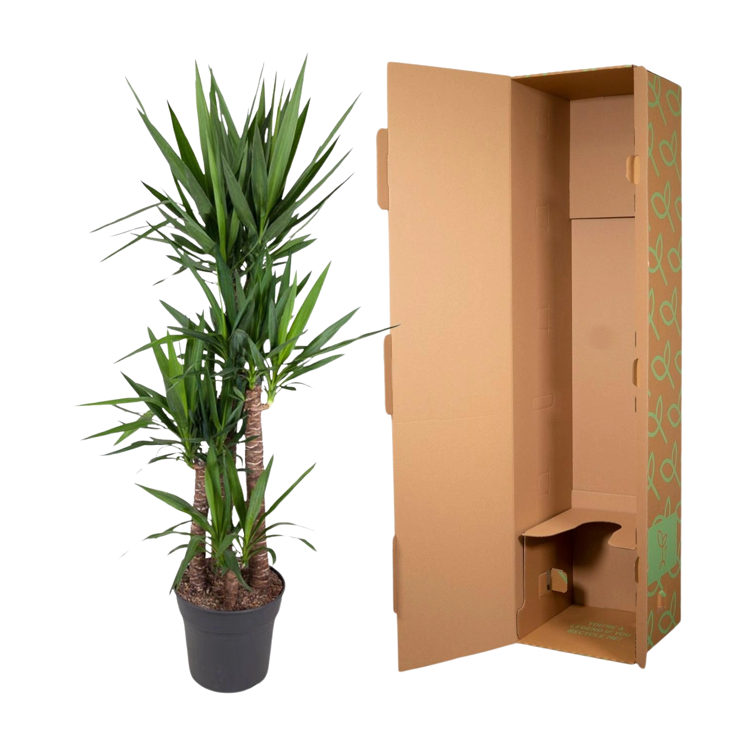 Wij zorgen voor een zorgvuldige verpakking in een stevige, speciaal ontworpen plantenverzenddoos. De plant en potgrond worden beschermd met een beschermhoes en stevig vastgezet, zodat jouw Yucca Elephantipe vers, gezond en onbeschadigd bij je thuis wordt bezorgd.